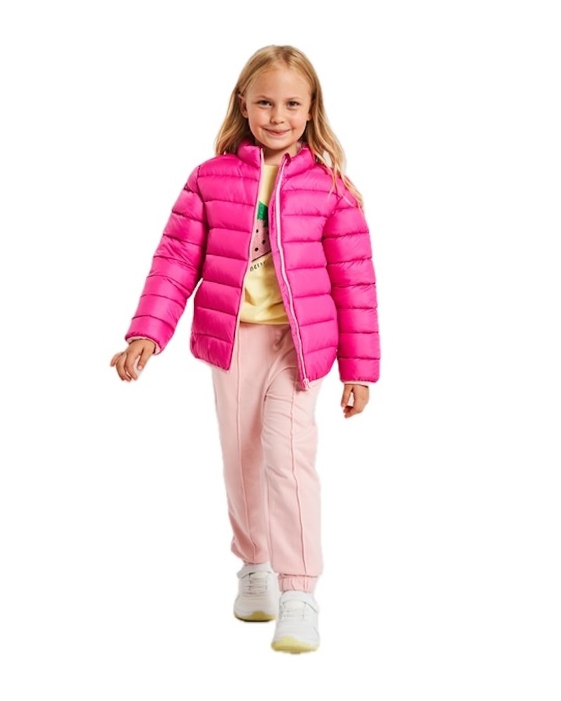 Pink waterproof puffer jacket, perfect for cold weather, for girls aged from 3 to 8 years.