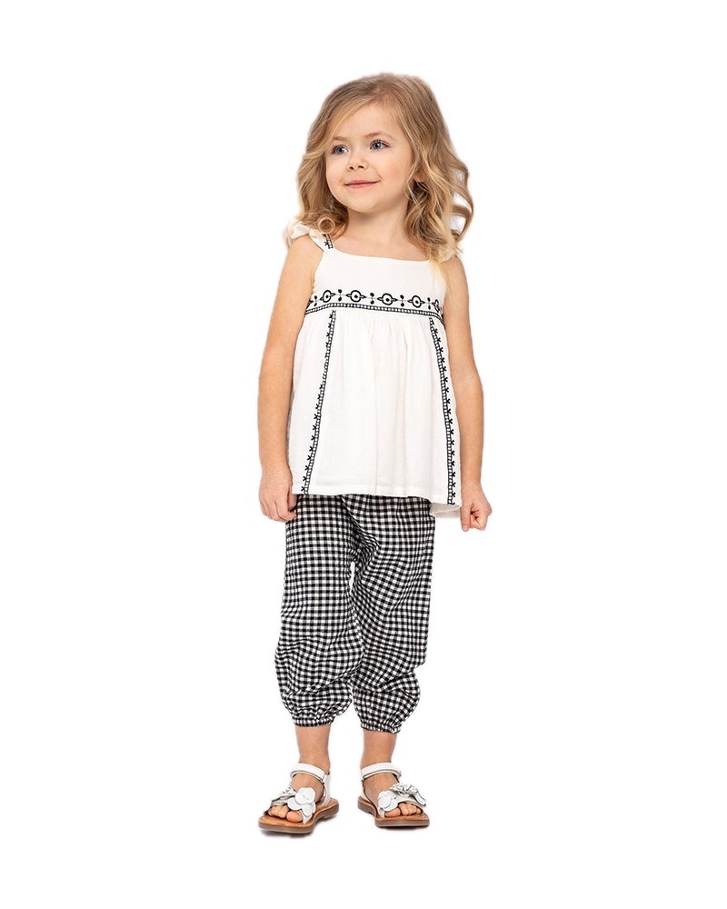 Ensemble haut blanc tissé brodé et short vichy noir pour fille de 1 à 3 ans.