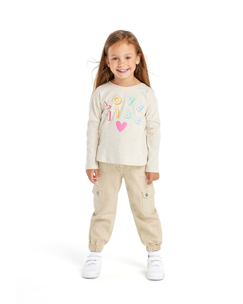 Pantalon combat beige, avec ourlets élastiqués, deux poches avant, deux poches latérales et deux poches arrière, pour fille de 1 à 3 ans.