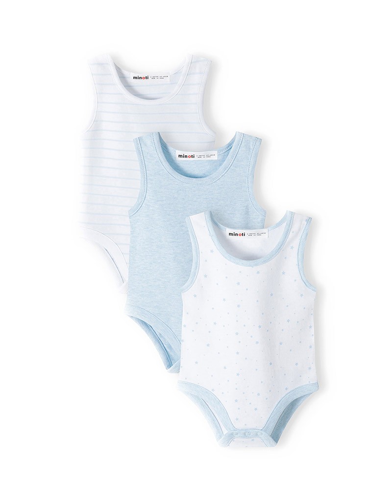 3 bodies sans manches blancs et bleus avec différents motifs pour garçon de 0 à 18 mois.