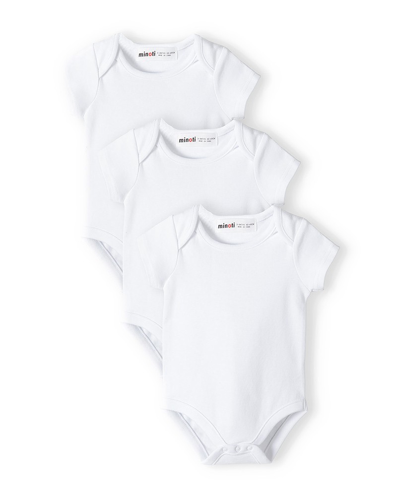 3 white simple unisex bodysuits with short sleeves for kids aged from 0 to 18 months.