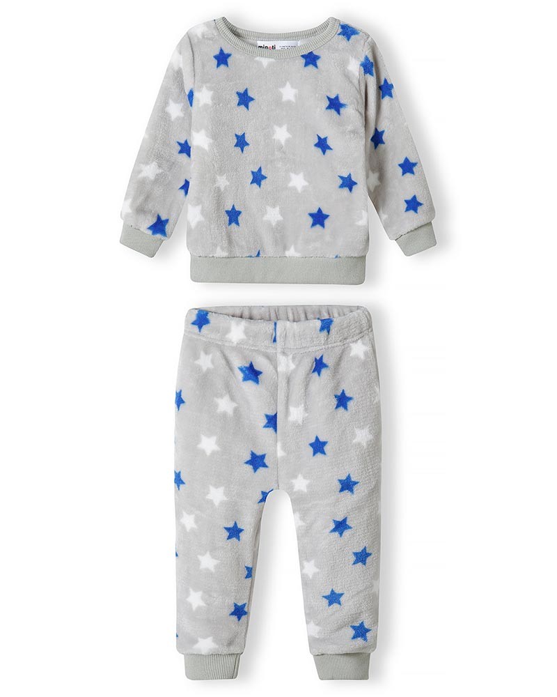 A cozy gray pyjama set made with soft fleece, featuring a blue and white colored stars pattern, for boys between the ages of 1 and 3 years.
