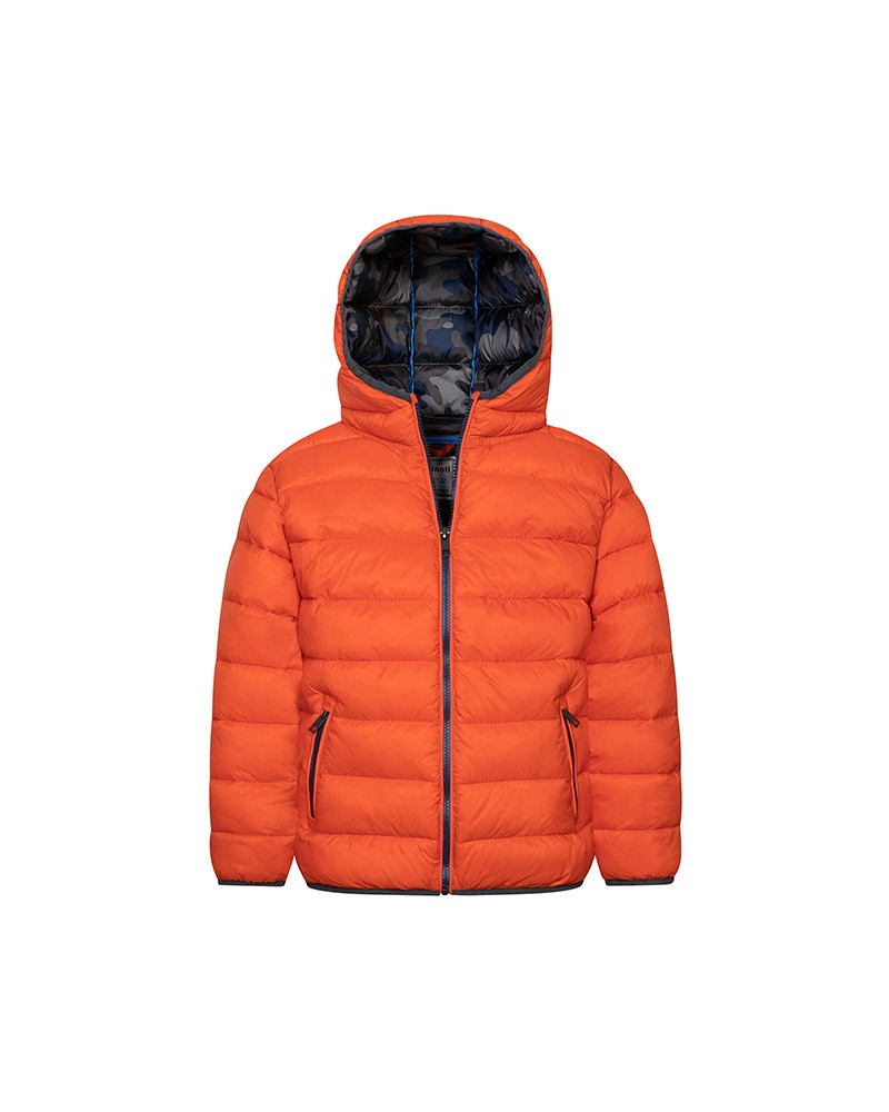 Doudoune orange imperméable à capuche fixe, base et poignets élastiqués.
