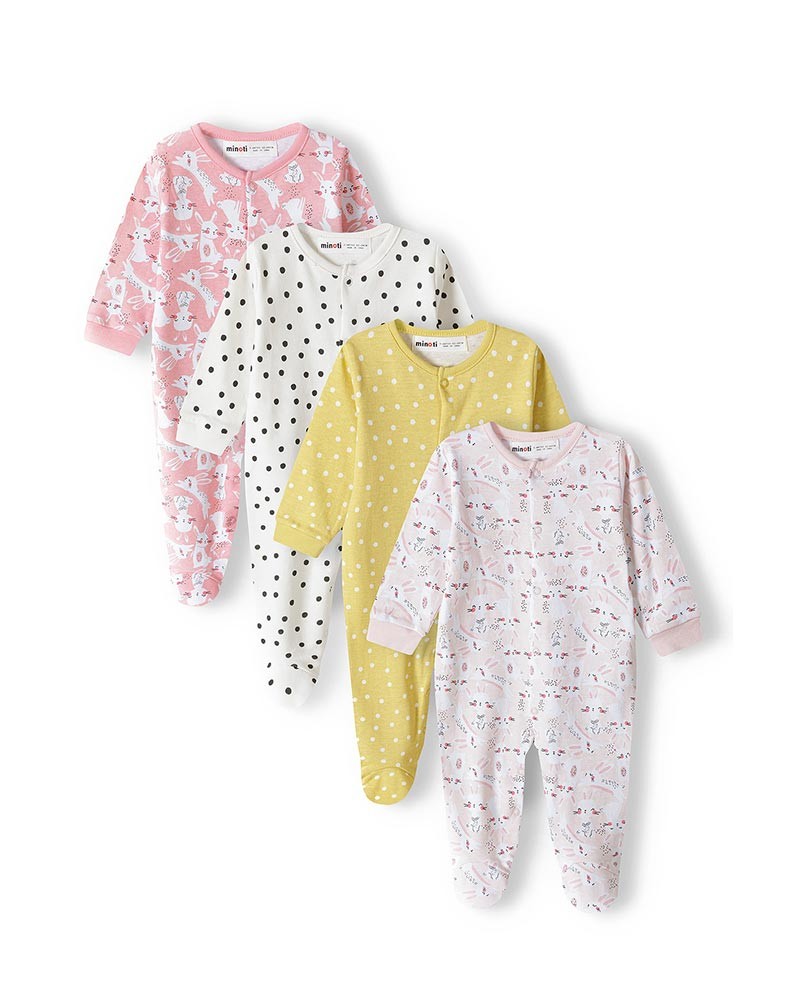 4 pyjamas rose, beige et jaune à manches longues et fermeture devant et entrejambe pressionnés pour faciliter l'enfilage et le change.